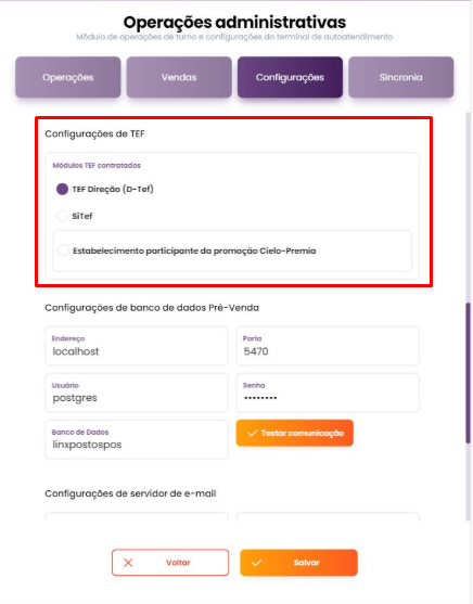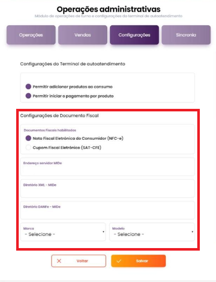 Ao acessar o menu Operações Administrativas, pressionar o botão Configurações. Através dessa opção, será possível configurar o documento fiscal, o TEF, dados de pré-venda, servidor de e-mail, além de configurações do próprio totem.