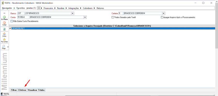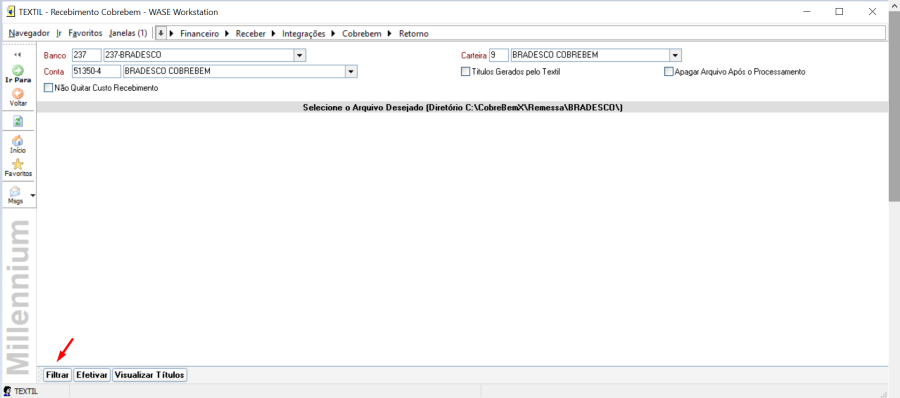 Preencha as informações de banco, carteira e conta. Depois mande filtrar, para que o sistema carregue os arquivos de retorno que estão no diretório C:\CobreBemX\Remessa\Bradesco.