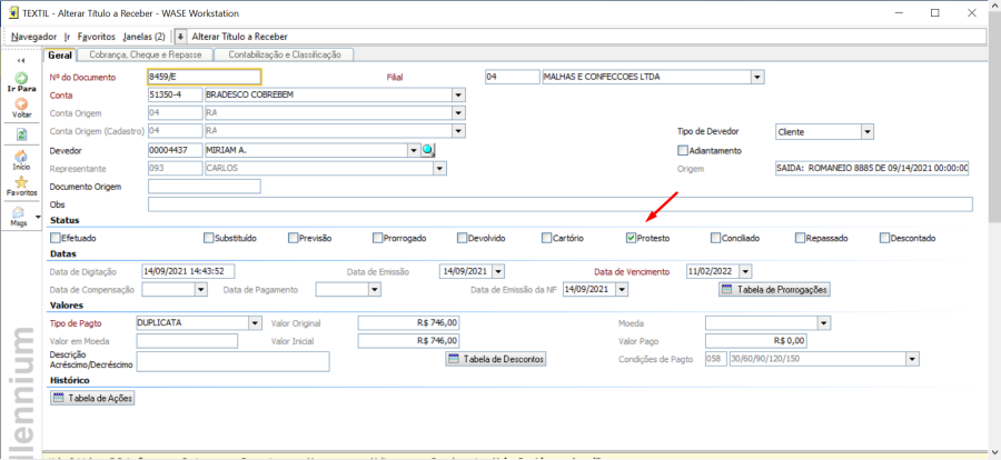 Entre na alteração do título, para visualizar os detalhes e perceba que se trata de um título protestado.