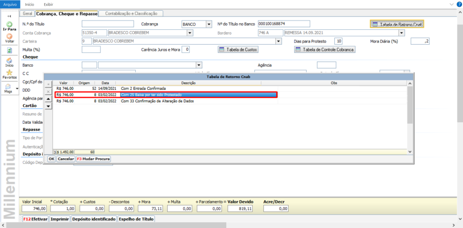 Após o ajuste realizado para o processamento do registro 25 arquivo de retorno foi processado e as informações de protesto para o banco Bradesco foram integradas ao sistema corretamente.