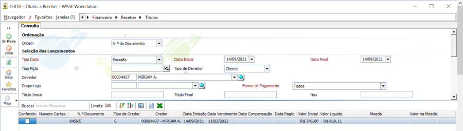 Em Financeiro\Receber\Títulos, faça uma consulta para visualizar os títulos que vieram no arquivo de retorno, em nosso exemplo veio apenas um.