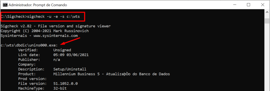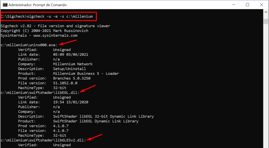 Repita o comando na pasta Millenium - sigcheck -u -e -s c:\millenium.