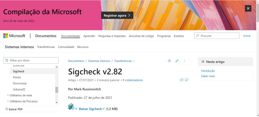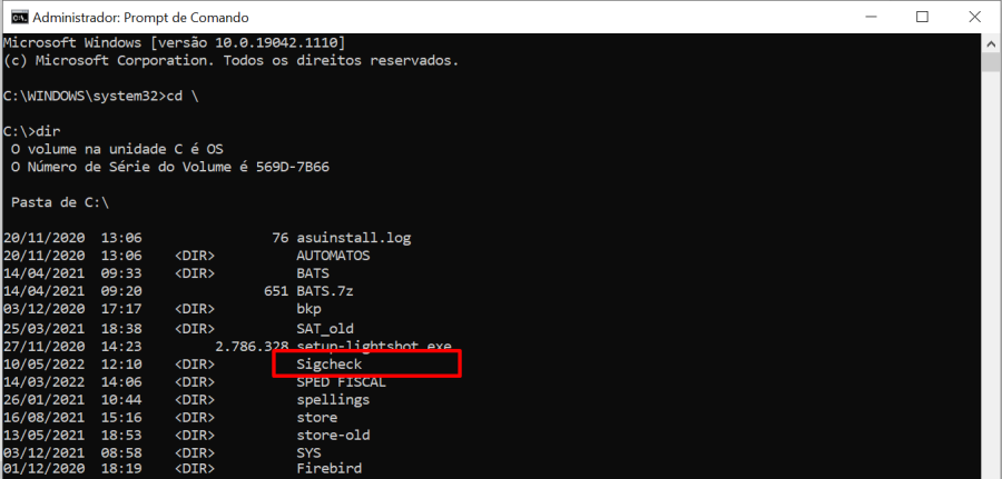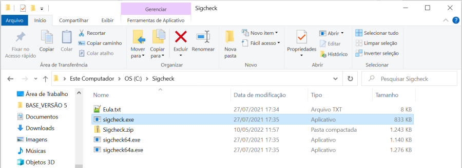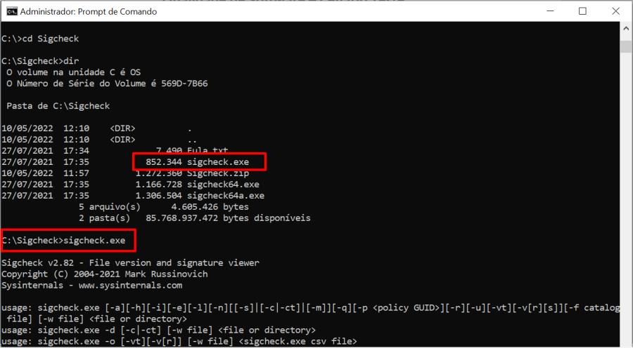 Usar o comando cd Sigcheck (para acessar a pasta onde foram extraídos os arquivos).