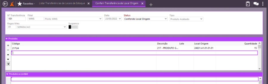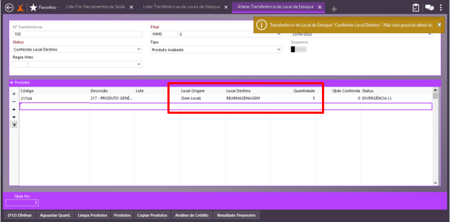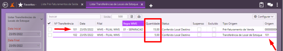 Em Logística\WMS\Transferência de Locais de Estoque, faça uma consulta e perceba que foi incluída uma transferência para a quantidade que não foi faturada, 5 peças, que deverão ser rearmazenadas.