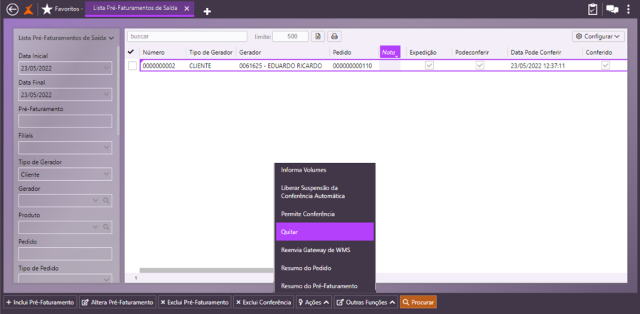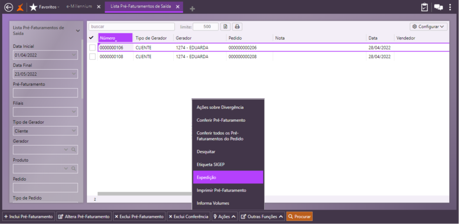 Faça uma nova consulta e observe que o campo Expedição está marcado e o pré-faturamento poderá ser conferido.