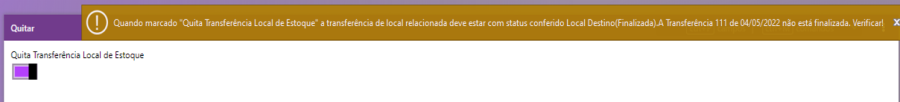 Se o usuário tentar quitar uma transferência de local que não esteja conferida no local de destino, o sistema emitirá uma mensagem de alerta e não permitirá a efetivação do processo.