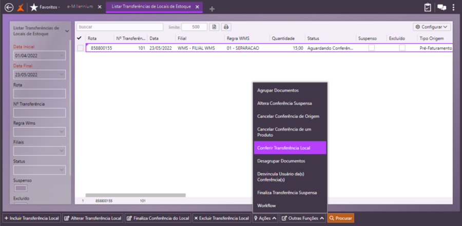 Em Logística\WMS\Transferência de Locais de Estoque, faça uma consulta e localize a transferência gerada para o pré-faturamento. No link Ações, selecione a opção Conferir Transferência de Local.