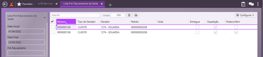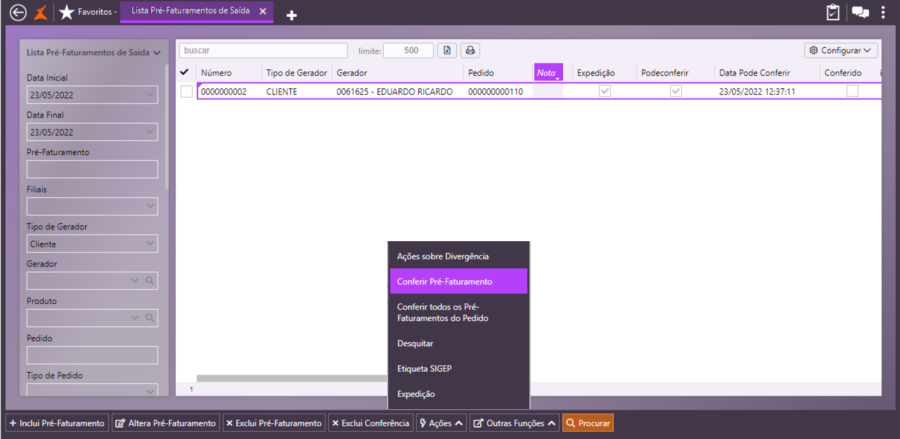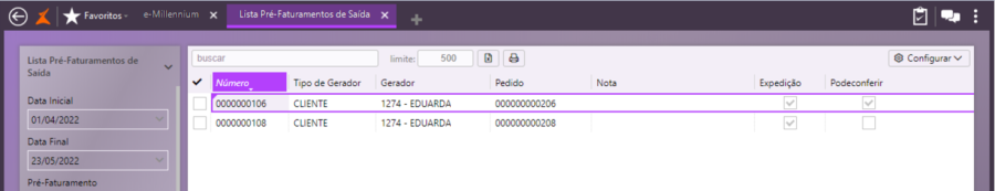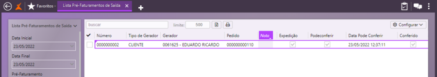 Ao consultar novamente o pré-faturamento, observe que o campo Conferido está marcado.