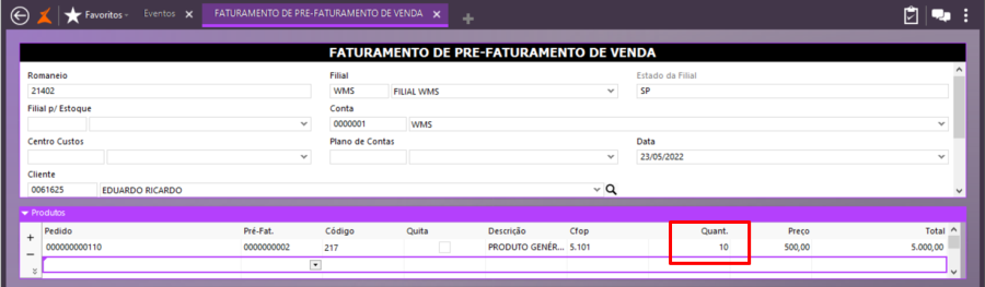 Faturamento do pré-faturamento com quantidade menor