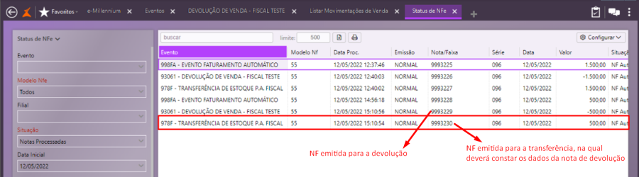 Em Vendas\Status NFe, faça uma consulta e aguarde a autorização da Sefaz, localize a nota fiscal de transferência que foi gerada pela devolução e observe o preenchimento do campo Dados Adicionais.