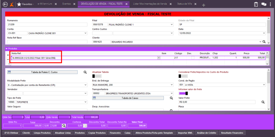 Em Vendas\Movimentações, selecione o evento de devolução de vendas. Preencha as informações do cabeçalho do evento e selecione a nota fiscal devolvida, como referência.