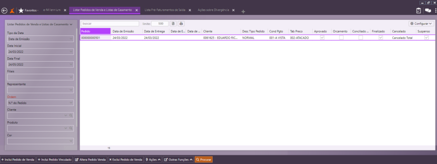 Observação: caso no campo Ação, você selecione a ação Cancelar o pedido inteiro, na tela Listar Pedidos de Venda e Listas de Casamento, na coluna Cancelado, o pedido aparecerá como Cancelado Total.