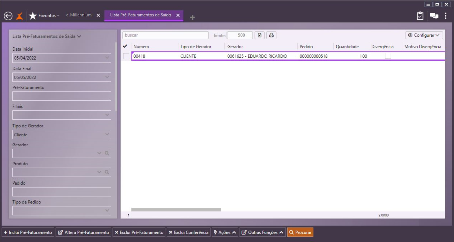 Consultando novamente, o pré-faturamento estará com a caixa de seleção Divergência desmarcada e com o valor da Quantidade alterada.