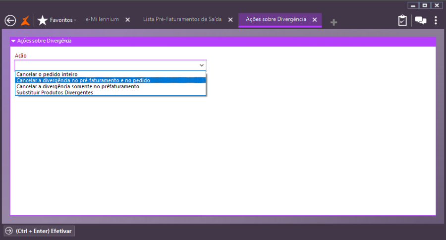 Desenvolvimento    Millen-12827 - MILLEN-9361 - Cancelamento e divergência em pré-faturamento