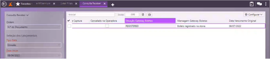 Em Financeiro\A Receber, faça uma consulta para visualizar o título gerado e observe que a situação do boleto gerado já consta como registrado na Stone, isso porque o registro é automático, assim que o boleto é enviado.