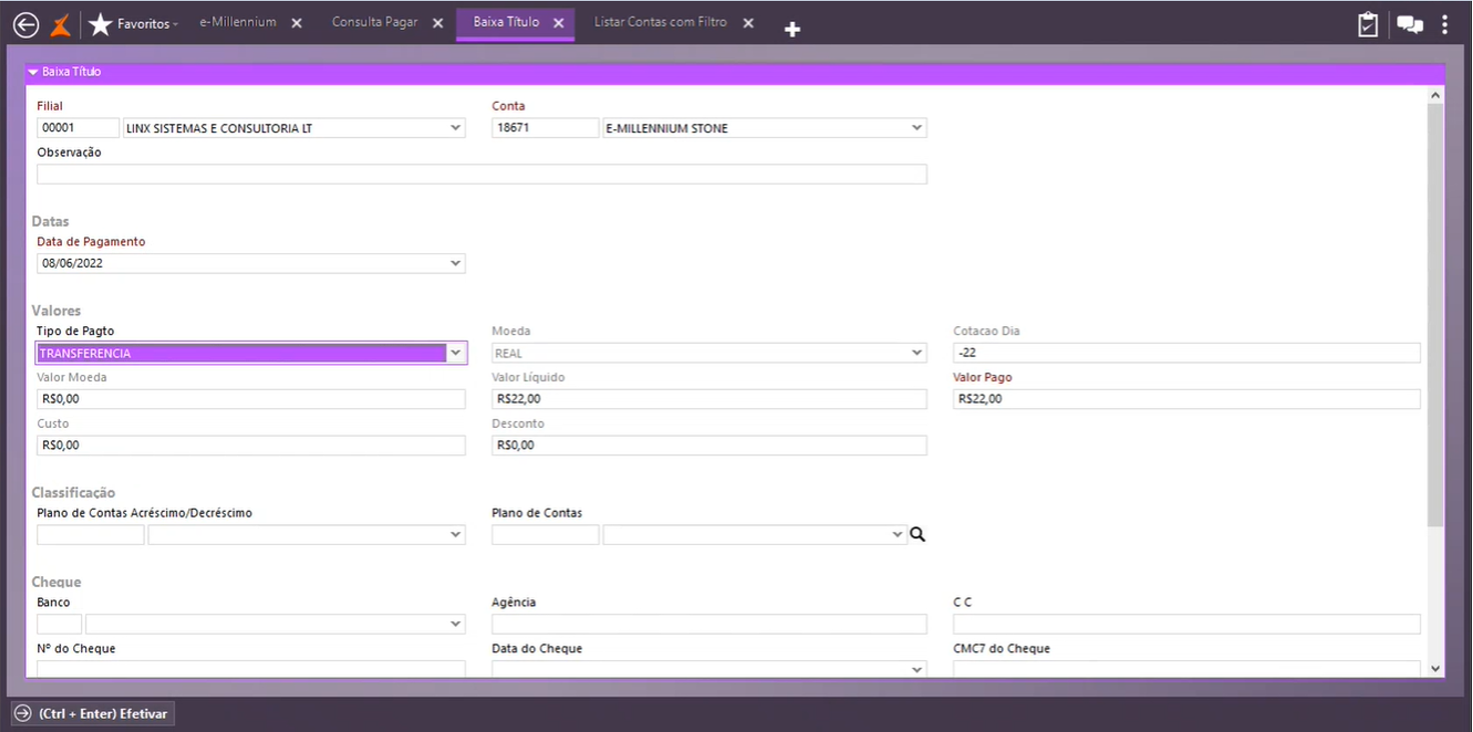 Após a aprovação por parte do usuário, o sistema fará o processamento da transação e atualizará o status do título. Para consultar a baixa do título, ligue o parâmetro Efetuado e observe o resultado da integração realizada.