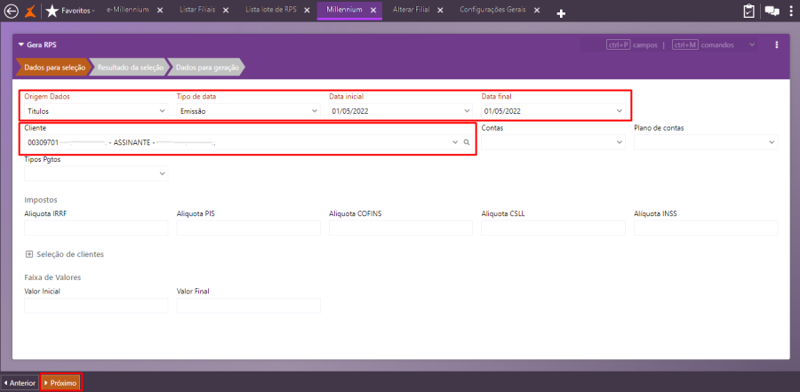 3. Na tela Dados para seleção, preencha os campos: Origem Dados, Tipo de data, Data Inicial, Data Final e Cliente;