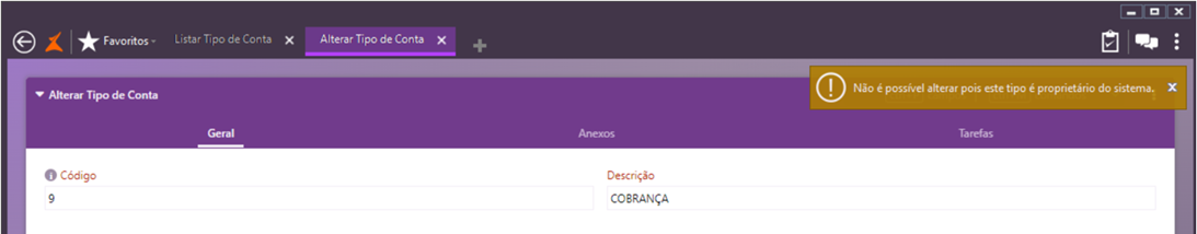 Ao tentar alterar um de tipo de conta exclusivo do sistema, uma mensagem de alerta será emitida e a ação será bloqueada.