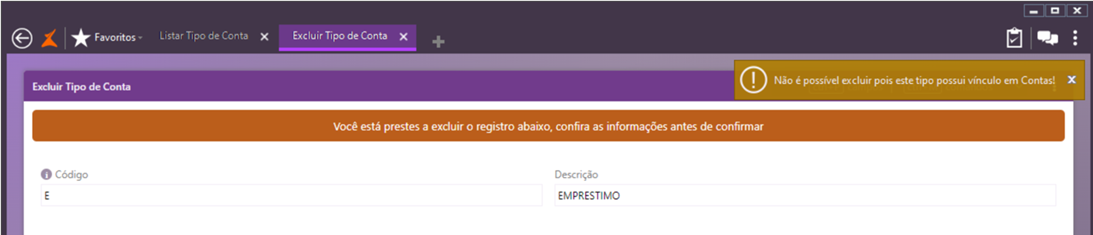 Ao tentar excluir um tipo de conta que já esteja vinculado a alguma conta cadastrada no sistema, uma mensagem de alerta será emitida e a ação será bloqueada. Isso ocorrerá com qualquer tipo de conta, de uso exclusivo do sistema ou não.
