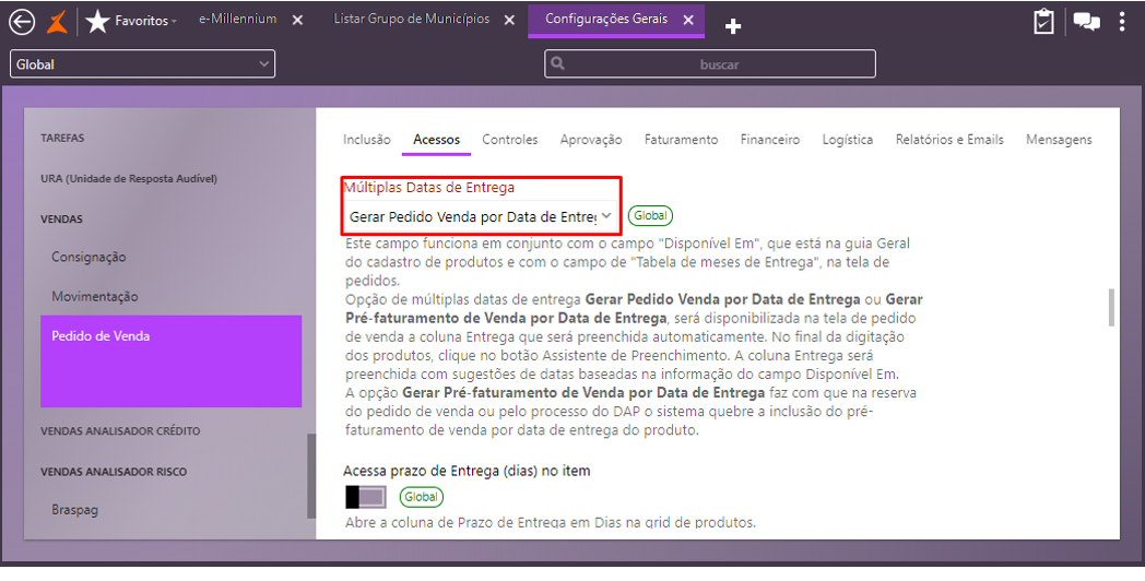 Na guia Acessos, campo Múltiplas Datas de Entrega, selecione a opção Gerar Pedido Venda por Data de Entrega;