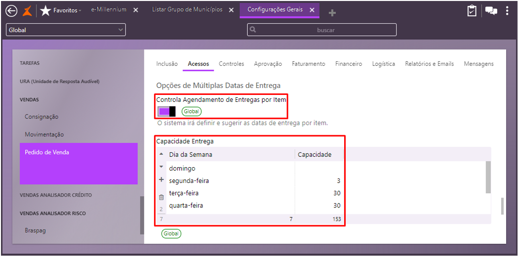 Quando os municípios do grupo estão sem nenhuma flag dos dias marcada e sem capacidade de entrega, o sistema irá considerar todos os dias habilitados e carregar a capacidade de entrega conforme parâmetros definidos em Configurações Gerais (ver passo 3 do item B).