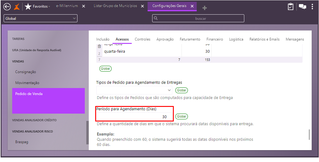 No campo Período para Agendamento (Dias), defina a quantidade de dias em que o sistema procurará datas disponíveis para entrega;