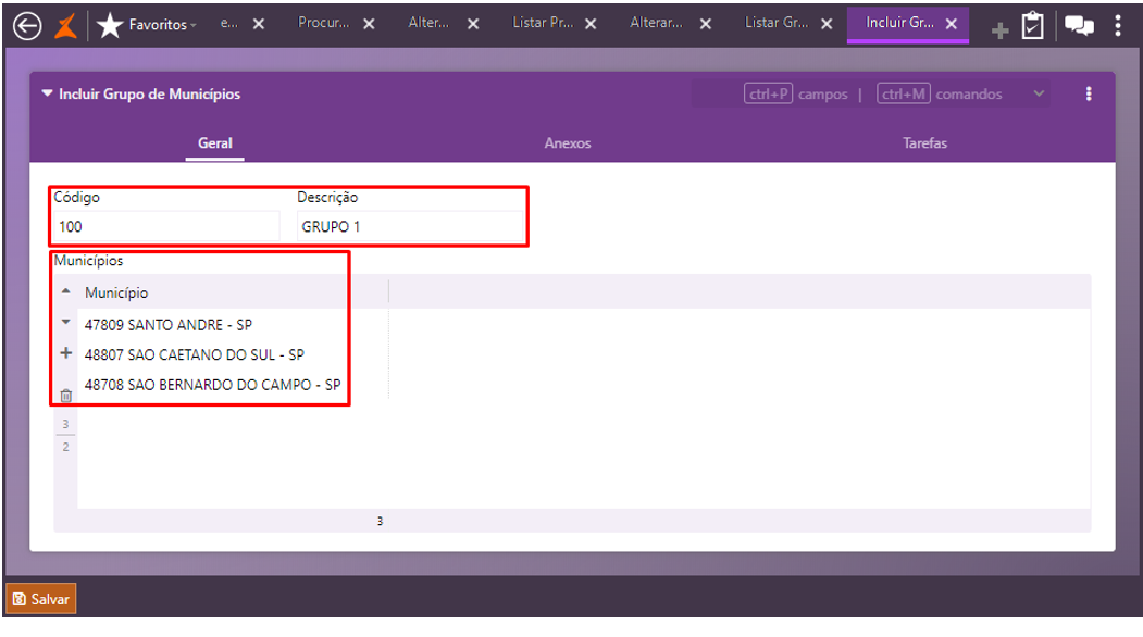 Inclua os municípios que farão parte do grupo de entrega no grid Municípios; Atenção: um município não pode ser alocado em mais de um grupo de municípios.
