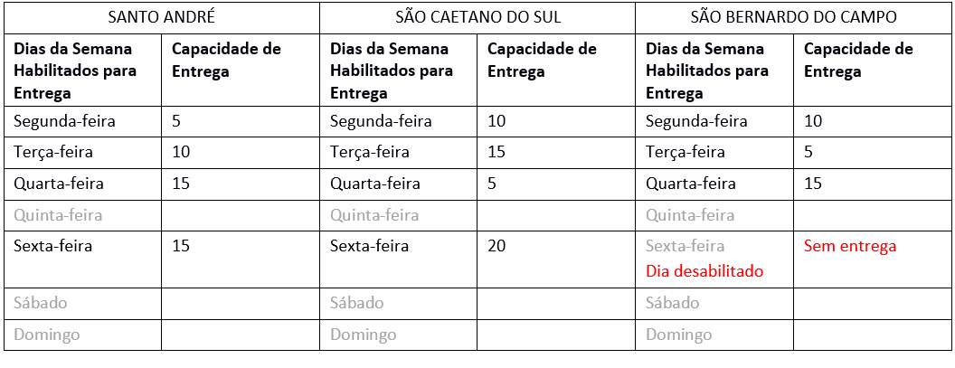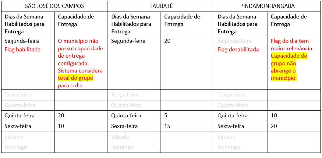 Na situação da flag estar marcada para um determinado dia, mesmo que a capacidade desse município não esteja configurada para aquele dia, se outro(s) município(s) do grupo tiver(em) capacidade de entrega definida e flag marcada, será retornada capacidade total do grupo para aquele dia. É o caso de São José dos Campos.