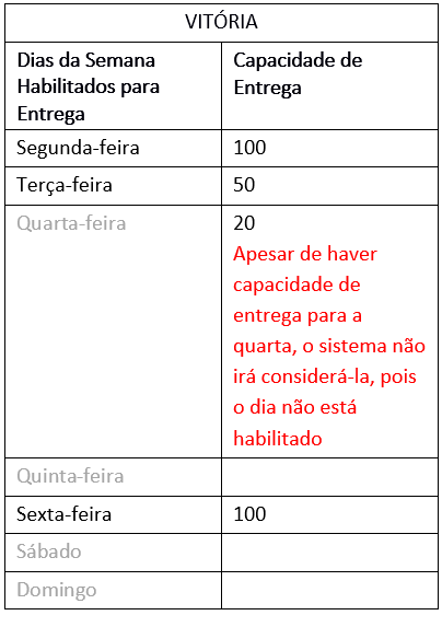 Se o município (sem grupo) possui flags de dias marcadas e capacidade de entrega lançada (sendo um dos dias com a capacidade lançada, sem a flag estar marcada), o sistema irá carregar as capacidades de entrega configuradas no município somente para os dias que as flags estiverem marcadas. Veja o exemplo: