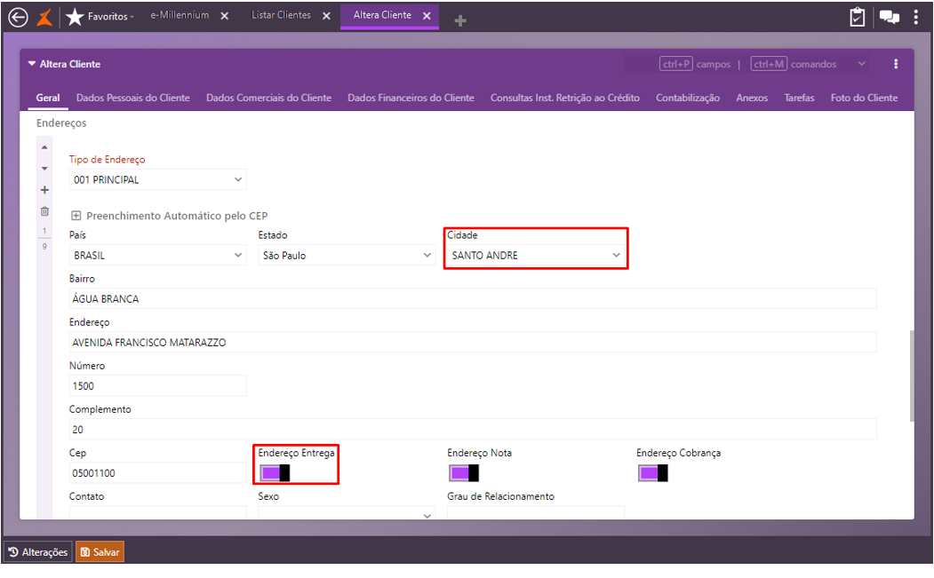 Na guia Geral, sessão Endereços, adicione o endereço de entrega;