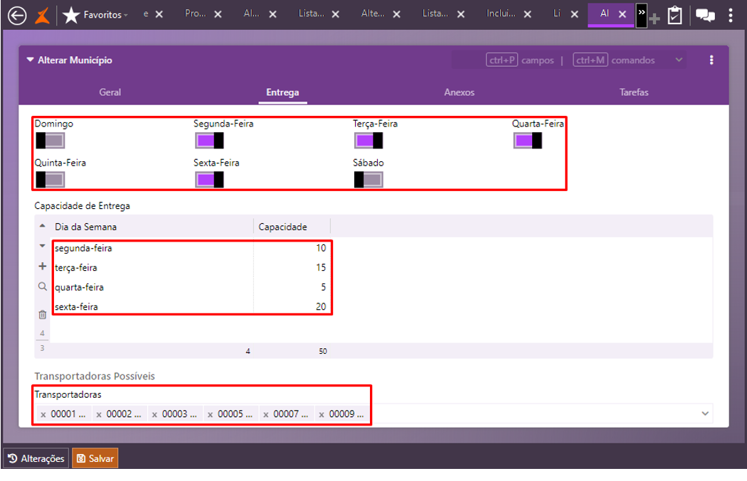 Na tela Alterar Município, guia Geral, defina os dias da semana para entrega habilitando as respectivas flags;