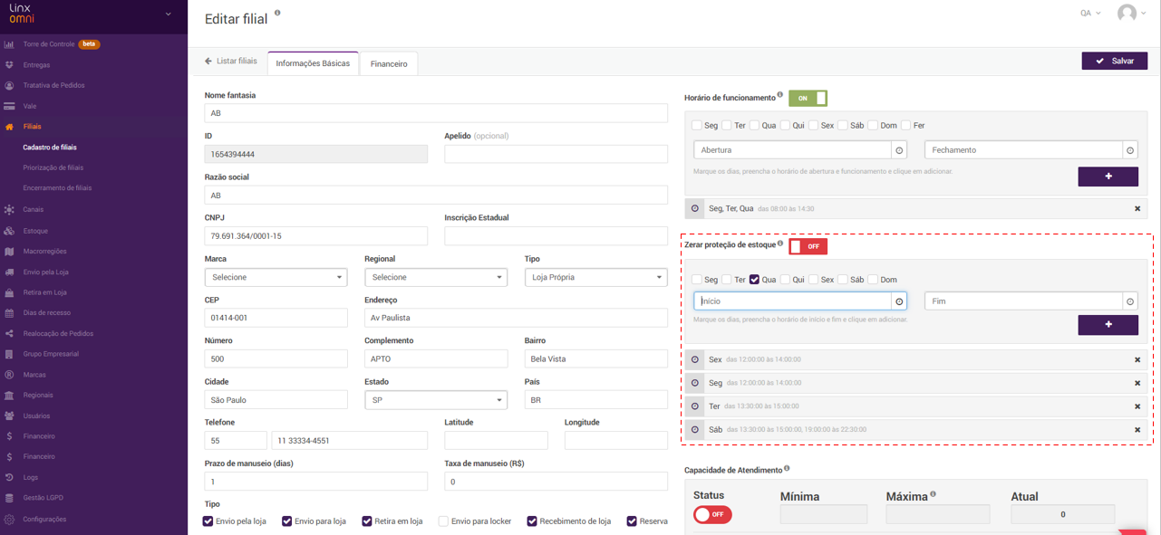 Ao habilitar essa opção, a proteção de estoque dessa filial nas cotações de frete serão zeradas nos dias e horários selecionados, respeitando a granularidade informada no tópico anterior.