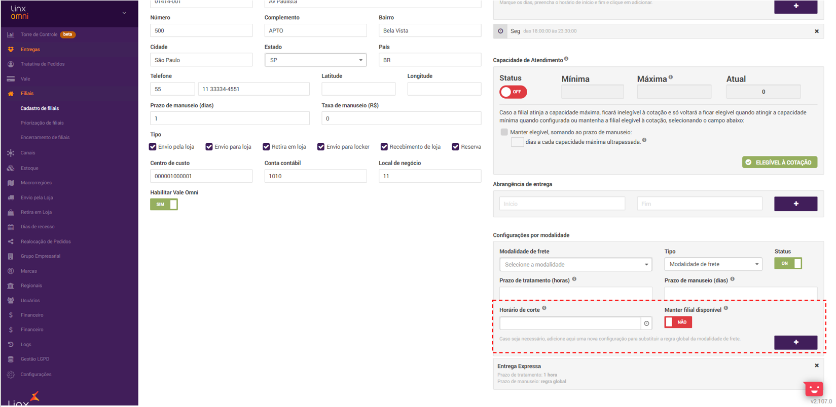Conforme Figura abaixo, é possível cadastrar o horário de corte e ativar ou não a flag "Manter filial disponível". Ambos os campos são opcionais. Quando não preenchidos, irá ser considerado o horário de corte global existente na Modalidade de Frete.