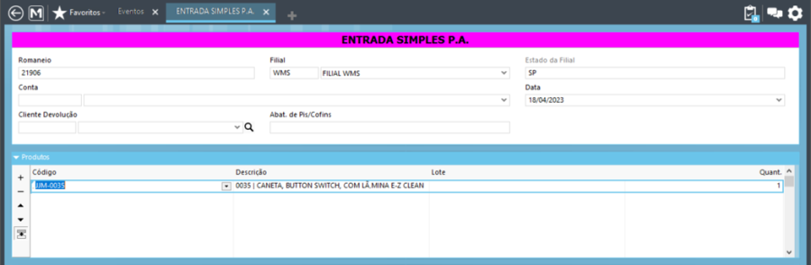 Em Logística\Recebimentos, vamos usar um evento simples para dar entrada na mercadoria e efetivar. Observe que a coluna lote não foi preenchida nesse momento.