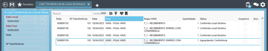 Em Logística\WMS\Transferência de Locais de Estoque, vamos consultar e localizar a transferência de local, gerada para esta demonstração. Observe que ela está aguardando conferência, que será feita utilizando o código de barras GS1.