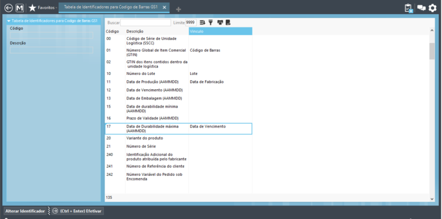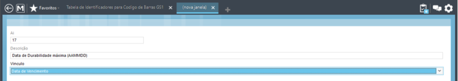 Vamos selecionar o código 17, Data de Durabilidade Máxima (AAMMDD), e dizer ao sistema que o dado a ser vinculado a ele será a Data de Vencimento do produto.