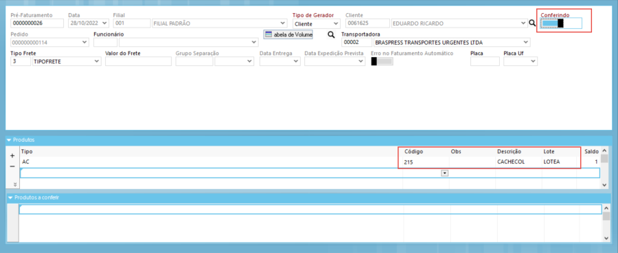 Marque o parâmetro 'Conferindo' e informe o código do produto e o lote.