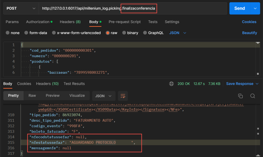 Ao efetivar e chamar a API millenium_log.picking.finalizaconferencia o e-Milennium estava retornando alguns valores Nulos. Após um tempo, retornava as informações corretamente. Analisando o cenário, foi verificado que os retornos nulos eram referentes às notas que estavam aguardando protocolo, ou seja, não foram processadas no momento da chamada da API.