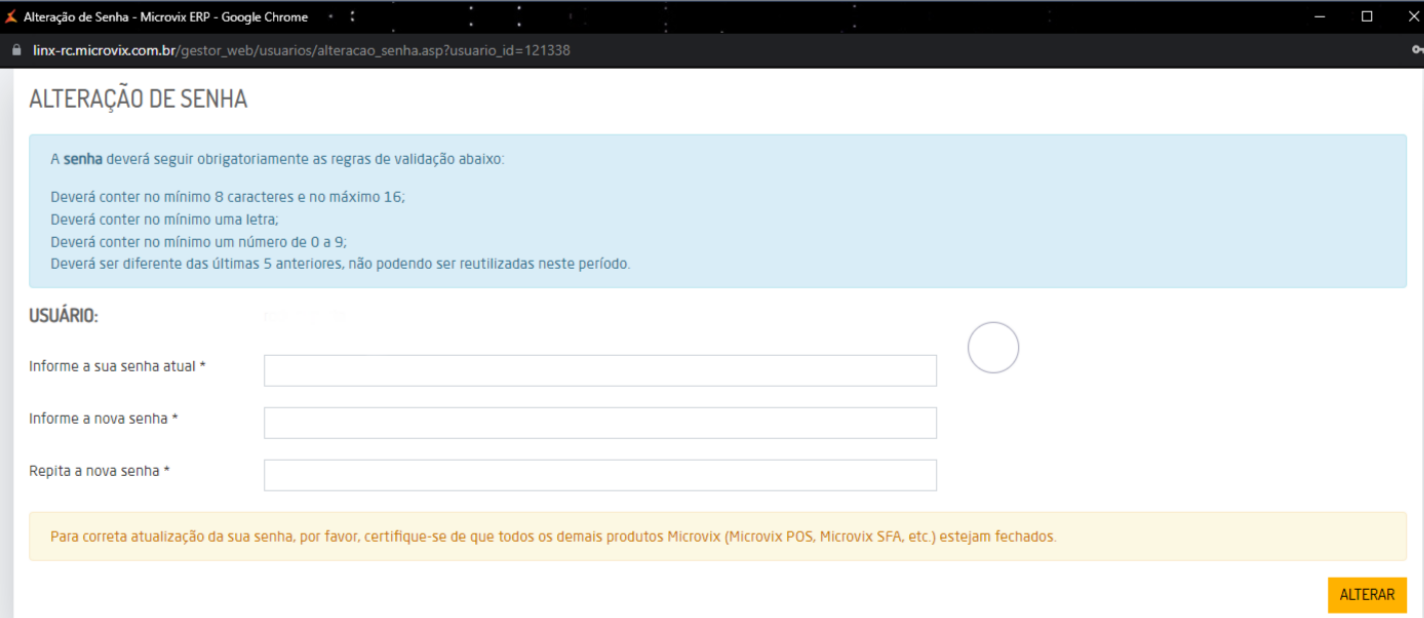 - Preencha a senha atual e a nova senha seguindo as regras dispostas na tela: