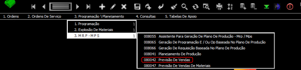 3. Selecione Programação \ Planejamento > MRP - MPS > 008042 Previsão De Vendas para abrir a tela.