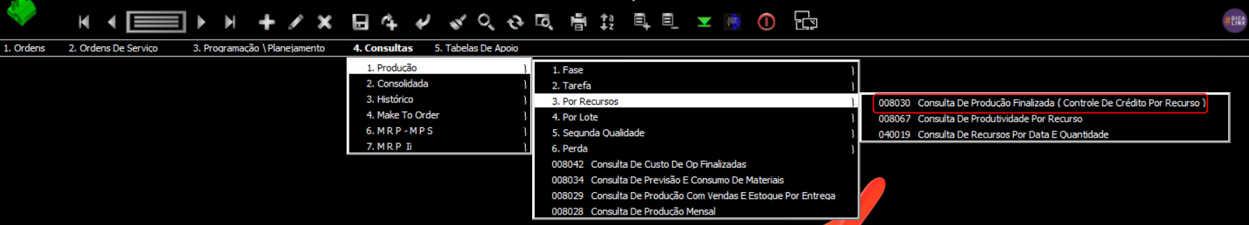 3. Selecione Consultas > Produção > Por Recursos > 008030 Consulta De Produção Finalizada ( Controle De Crédito Por Recurso ) para abrir a tela.