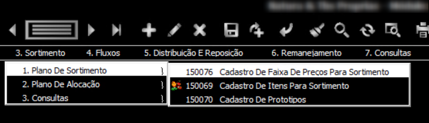 3. Clique na opção 3. Sortimento > 1. Plano De Sortimento > 150076 Cadastro de Faixa De Preços Para Sortimento: