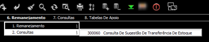 - Clique na opção 6. Remanejamento > 2. Consultas > 300060 Consulta De Sugestão De Transferência De Estoque: