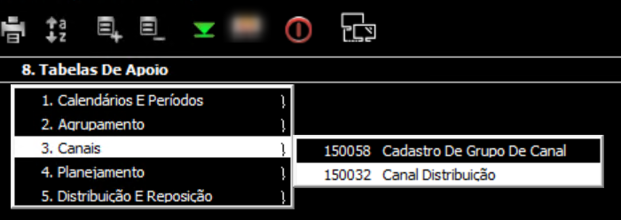 - Clique na opção 8. Tabelas De Apoio > 3. Canais > 150032 Canal Distribuição:
