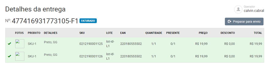 Figura 5- Detalhes da entrega - botão preparar para envio disponível
