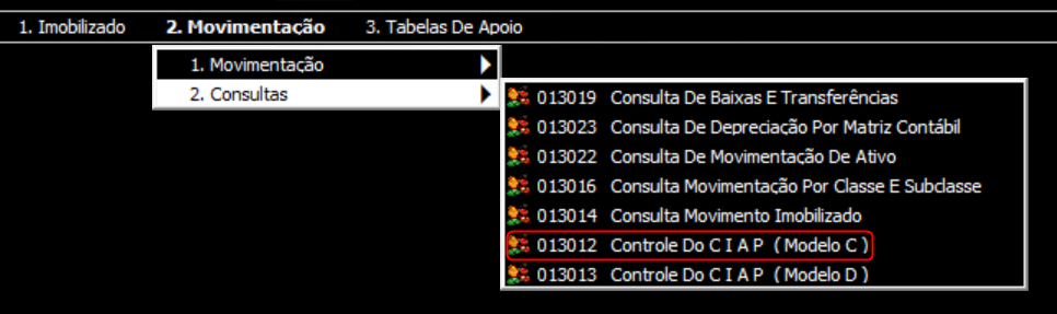 3. Selecione Movimentação > Consultas > 013012 Controle Do C I A P ( Modelo C ) para abrir a tela.