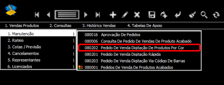 3. Selecione Vendas Produtos > Manutenção > 080202 Pedido De Venda Digitação De Produtos Por Cor para abrir a tela.
