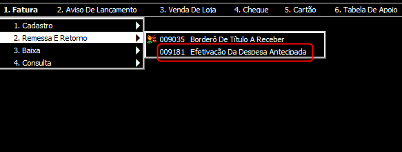 3. Selecione Fatura > Remessa E Retorno > 009181 Efetivação Da Despesa Antecipada.