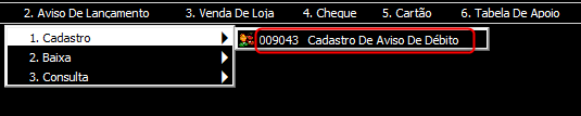 3. Selecione Aviso De Lançamento> Cadastro > 009043 Cadastro de Aviso de Débito.