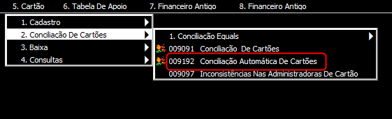 3. Selecione Cartão > Conciliação De Cartões > 009192 Conciliação Automática De Cartões